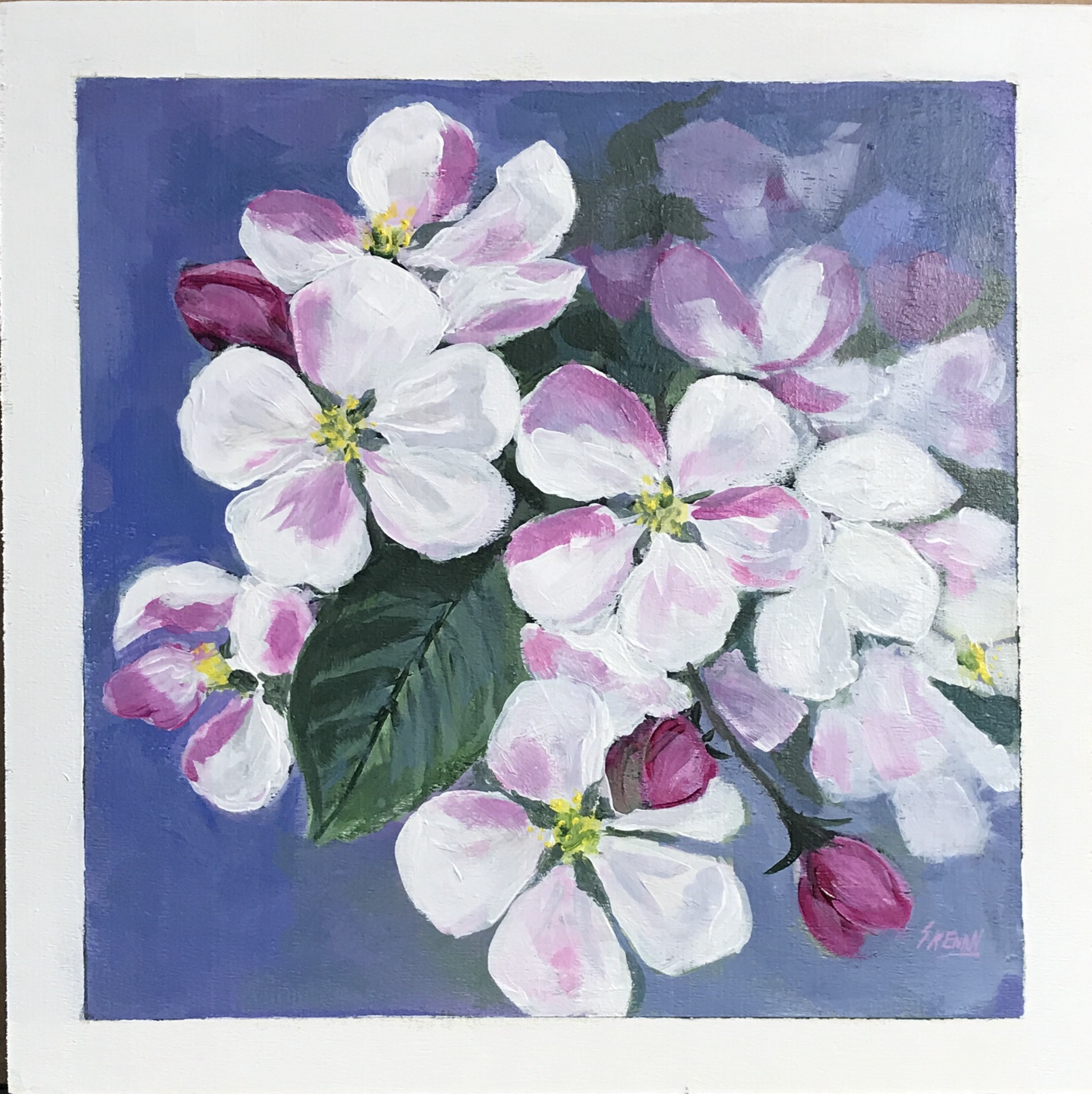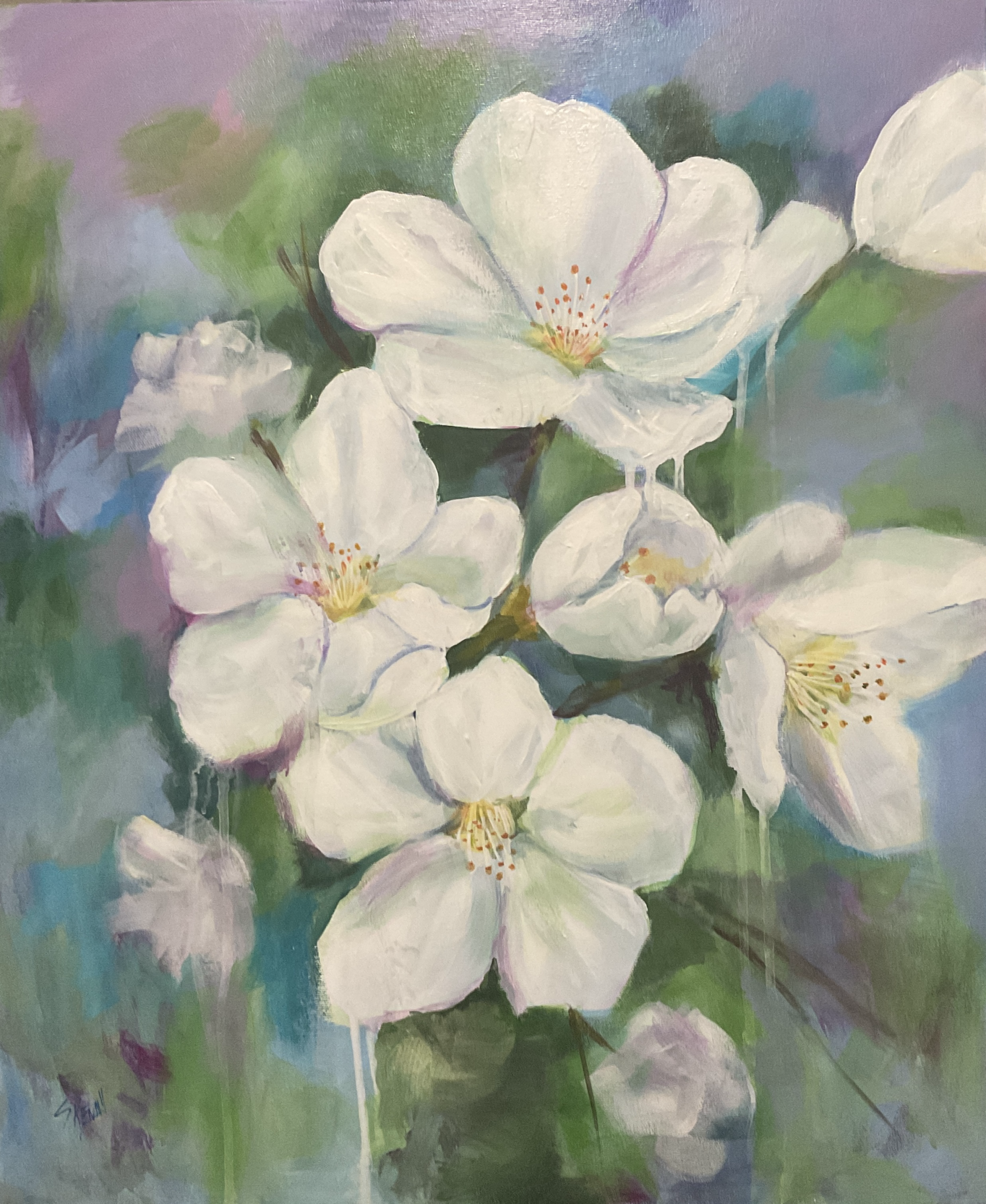 Soft white blossoms emerge against a dreamy wash of colour, capturing the fleeting beauty of spring. Gentle layers and subtle drips give the piece a sense of movement and freshness, while the delicate petals draw the viewer into a quiet moment in nature.  The painting reflects the simple elegance and renewal that blossoms bring each season.